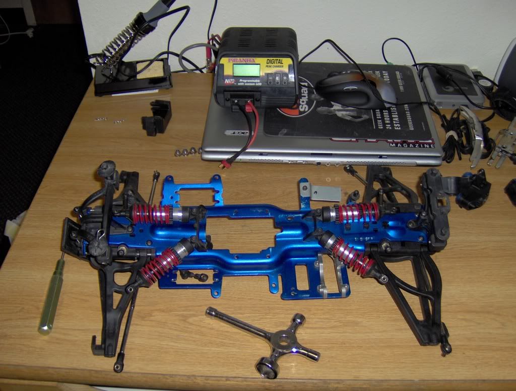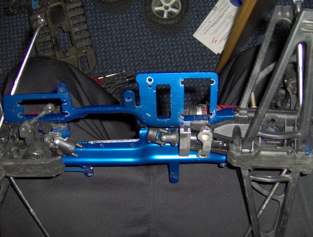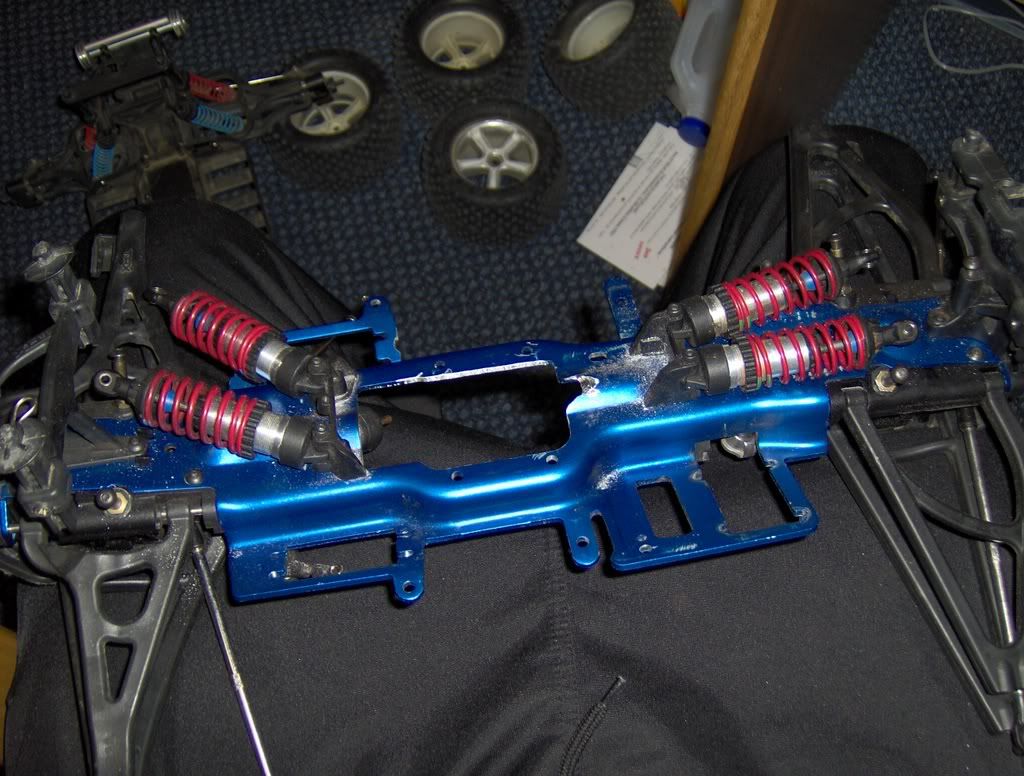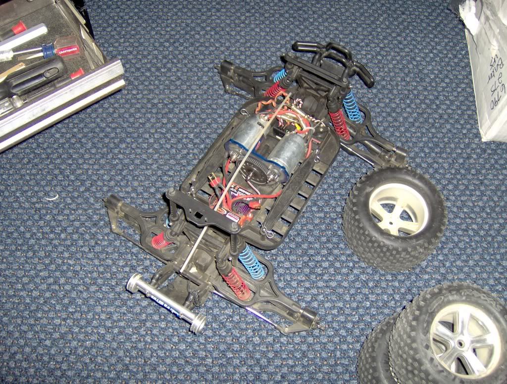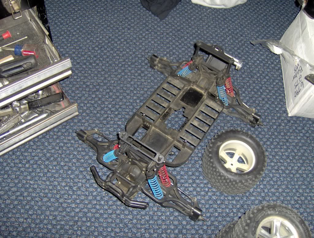 I've been looking to get my girlfriend a truck of her own. She likes my Revo and I originally had a RC10GT lined up for her, but the GT was just too small. I found a good deal on a RTR E-Maxx and a Revo rolling chassis. I'm taking the E-Maxx tranny, Titans, EVX, and part of the chassis to build a nice base for the E-Revo. The rest of the E-Maxx will be used for a crawler project of mine, but that's another thread. Along the way it will get the treatment of anything pink I can find for a Revo, including a nice lid. On to the pics.