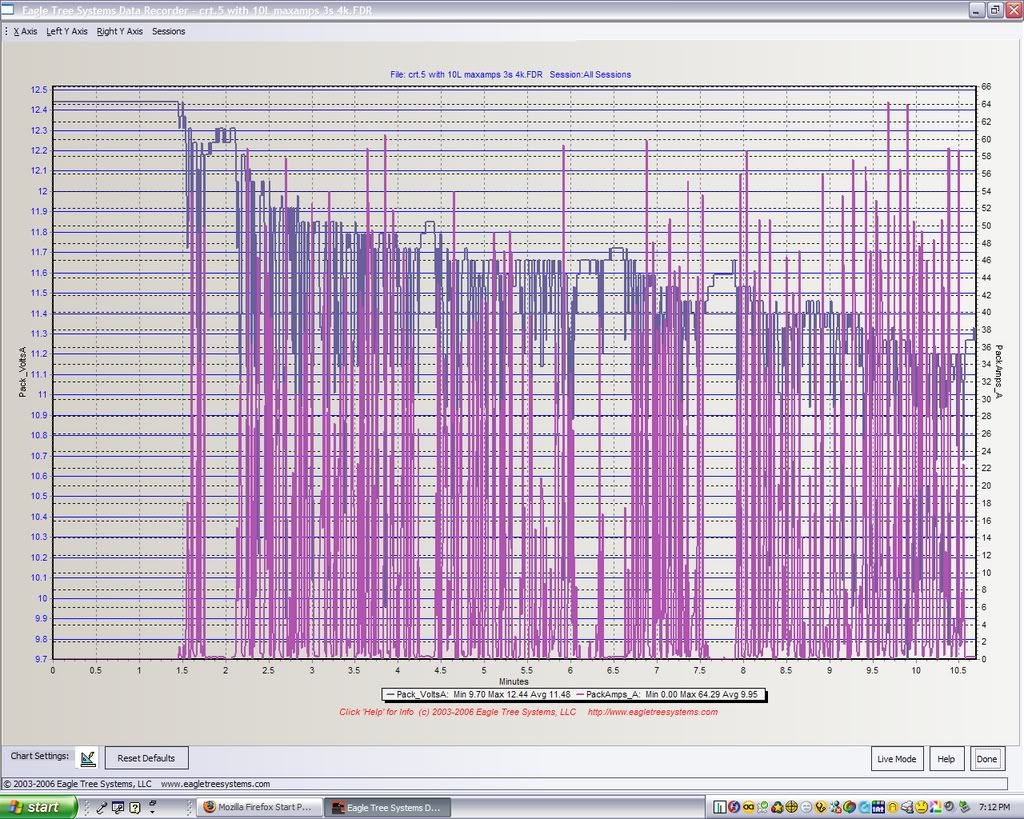 Brian, I ran the crt.5 again with the 10L and maxamps 3s 4000 pack. I hooked up the eagle tree to it and found some interesting numbers. Apparently the 4000's are not really 20c, more like 10-12c. Disappointing to say the least. What do you think, here is the graph. 64 amps and the pack voltage drops down to 9.7! I thought these were supposed to do 80 amps continuous, 120 amps sustained, and 200 amps burst...