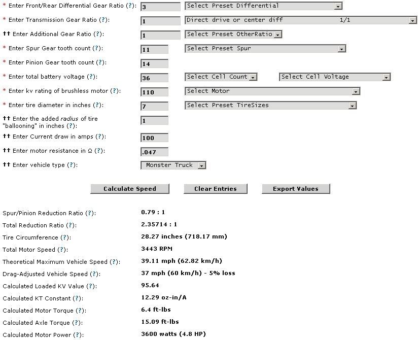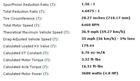What did you enter for voltage/current draw? The motor you want can only handle 350W. That's less than 1/2 HP. There's no way it will handle 4000W. 350W is in brushed 540 motor territory. I think you'd be lucky if you got 20 mph with that setup your looking at. I'm all for the conversion, but you need to do some more research before you buy. I would want at least 1000W in that truck to get good performance out of it. 1000W is easy: 20V @ 50A. etc. You should shoot Aqwut a PM. He has a lot of experience with big, powerful conversions. Good luck!