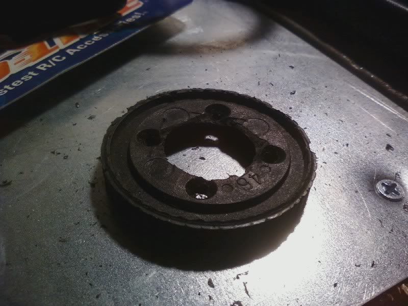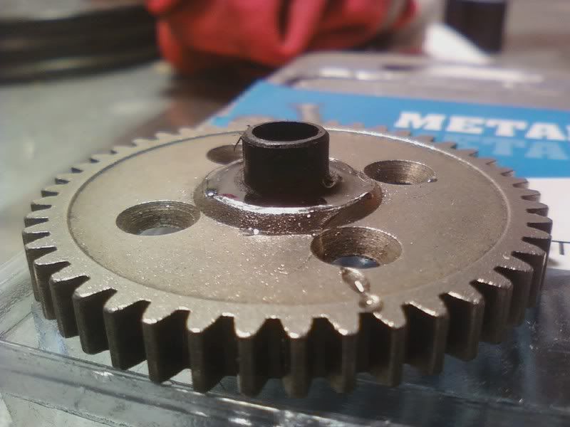 The new gear is from a Cen Genesis, it had a different output then standard 1/8th scale diffs so the bearing race was pressed out by mike(can see it in the picture.. Going to have to take the bearing race out of the old spur and fuse it to the new, most likely with 2 part epoxy or Jb weld.