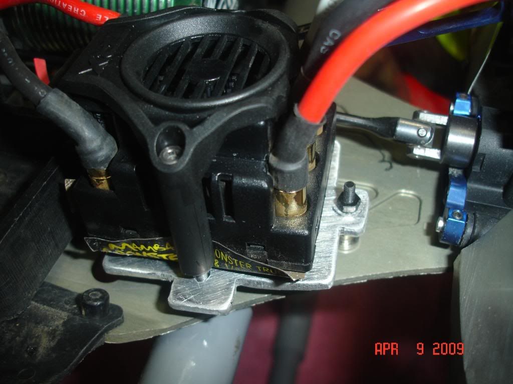 Anyway, I received the Traxxas ESC mount and decided to install one of them on my truggy. I got the mounting plate idea from rootar. I had to move the battery plate half an inch forward to make room for the ESC. Here are some pics.
