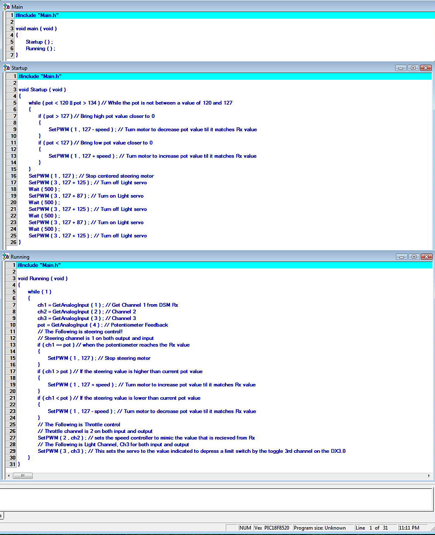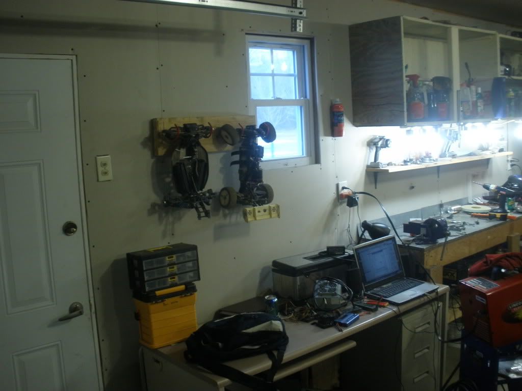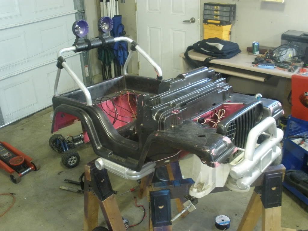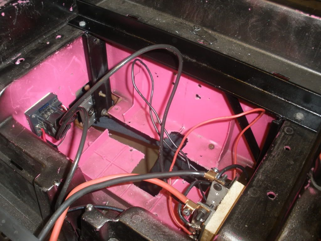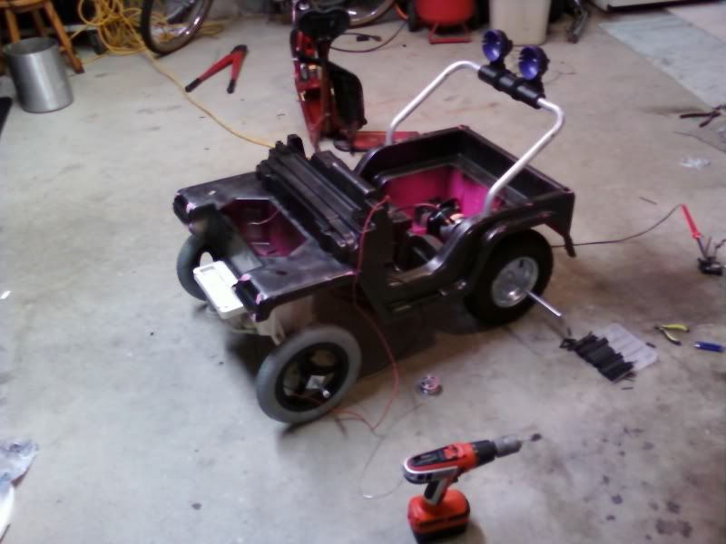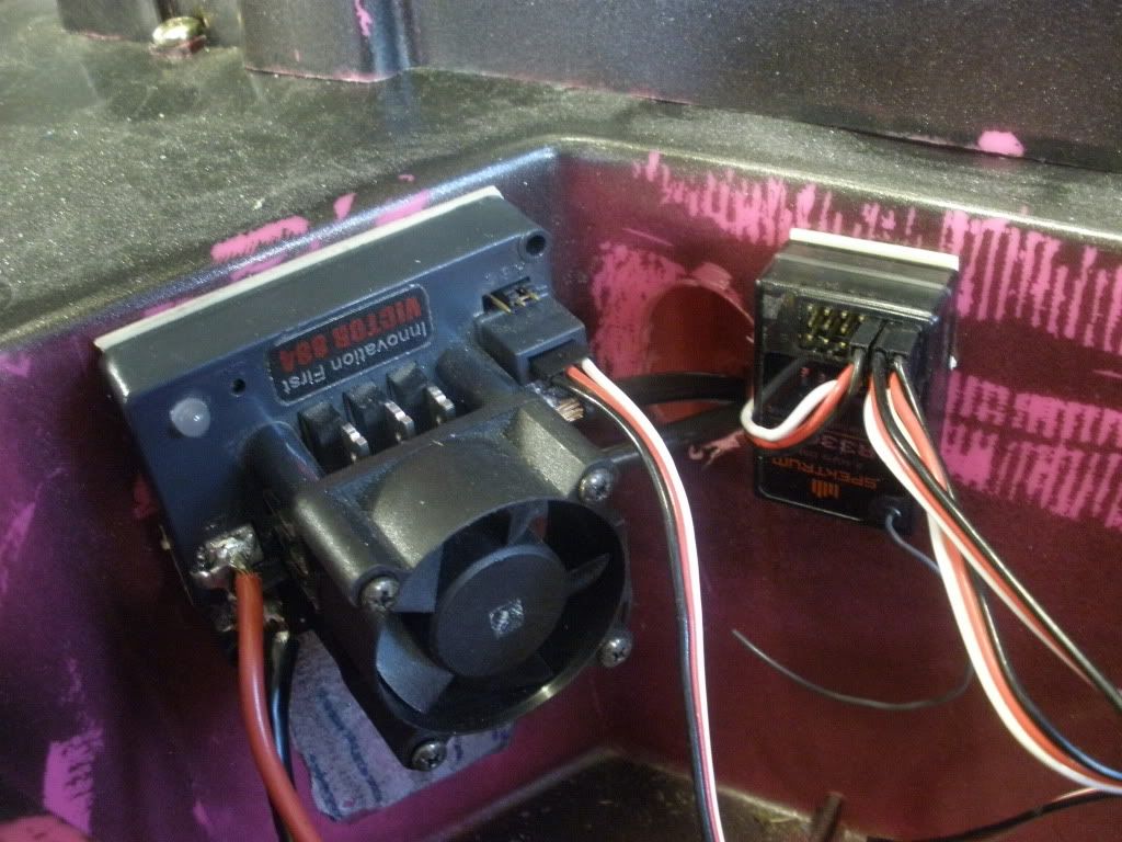 NeuEnergy 4s 5000mAh 25c sending power to 2 speed controllers, and the headlights. The headlights has 2 switches in parallel. A dashboard switch, and a momentary switch actuated by a servo in 3rd channel. This lets the headlights be turned on remotely or by a manual switch. The speed controllers are a IFI Victor 883 30v brushed controller, powering a 540watt razor scooter motor I found at a garage sale. This motor is in a custom mount welded/fabricated by ben (brushlessboy16) and is driving the solid rear axle by 25 chain. The steering is using the stock drive motor and transmission, powered by a Victor 884 speed controller. The outdrive of the 147:1 transmission has a ton of torque for steering power, and has a piece of allthread on it, for steering. Since I do not have what i need to make it auto centering and limited steering, We just ziptied it to the steering bar, so if me or ben were to oversteer, it would snap the zipties and not break anything else.