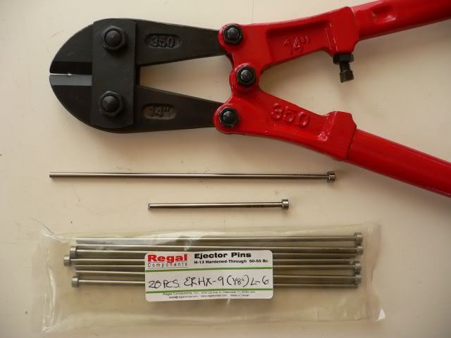 I wanted to test the ejector pins used by george16 because I'm fed up bending Lunsford hinge pins (lower ones). I needed a good bolt cutter to cut these pins ! Here is the result :