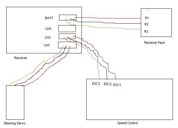 All that in mind, I think what you're telling me (based on my drawings) is that I need to plug my receiver pack into "B" on the harness, and my ESC into "C" on the harness. Then plug "A" into an on/off switch and plug the other end of the switch into CH2 on my receiver. Is this right?