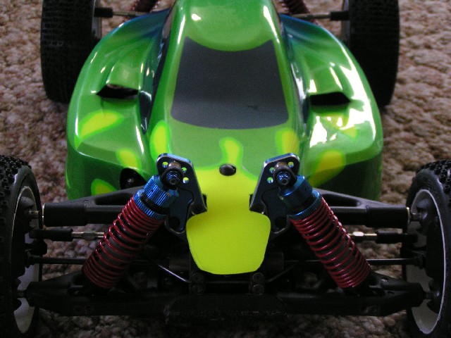 I found a body with no %#@& nitro holes. It is a JConcepts Illuzion for the mbx5; I had to get the mbx5 mudgaurds so it all fit up nice. I got the mbx5r mudgaurds which have a little strip of velcro on the sides to hold the body closed. I always used to run my old racing 10T that way. The body has a couple of "hood scoops" on the sides (see pics) which I cut out to give air flow to motor, etc. I got the extra heavy one (adds 1 oz) just to help protect things. Not too happy with my paint job either, I just need to invest in a better airbrush (and maybe better color selections. lol).
