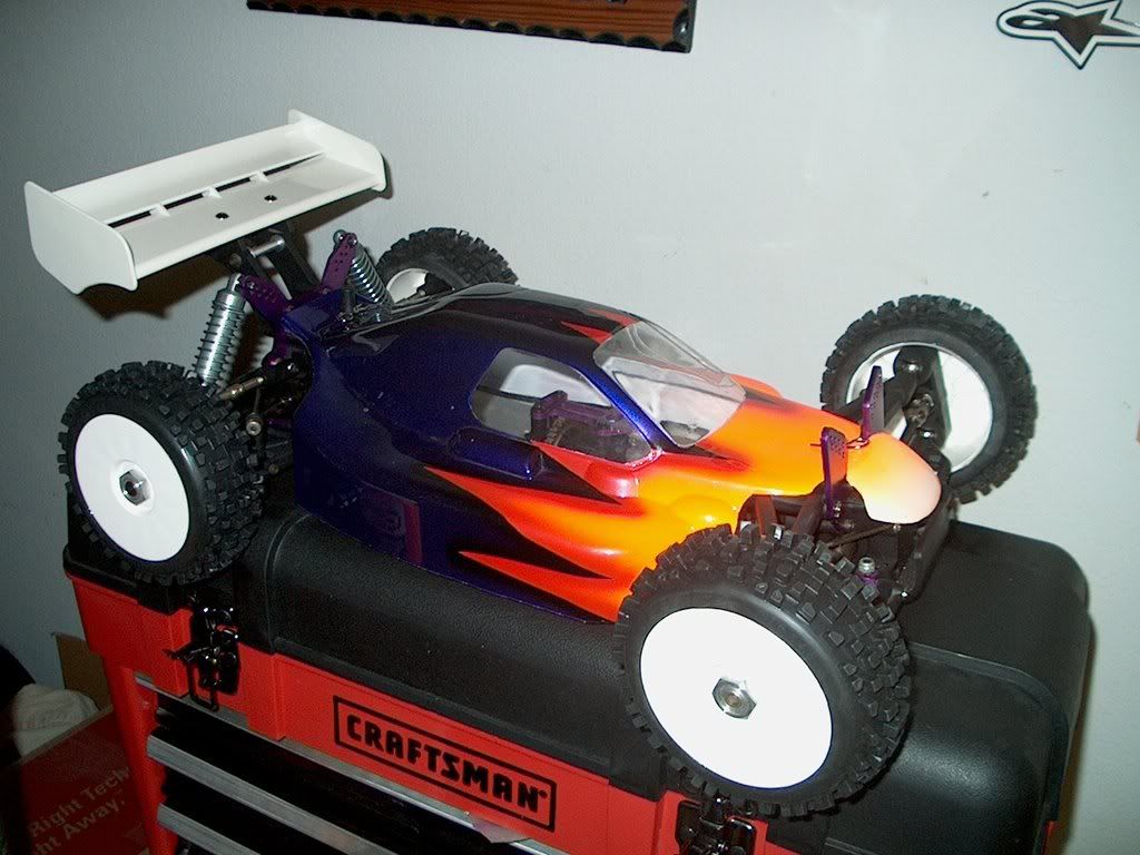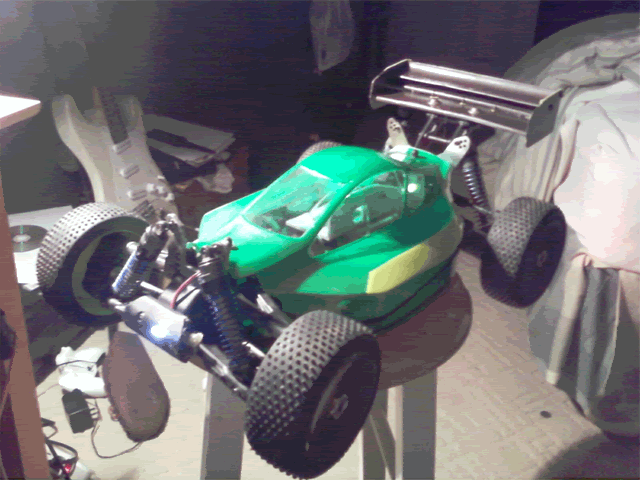 and to make it even nicer, LEDs! I have a white one out the front, a red one out the back, and 4 green ones inside the body! sorry for the bad pic quality, but gif's suck as a picture format... The LED's are glued in nice and the wires are all tucked out of the way, but the power system ads a bit of extra weight... I have glued in my hyper a 9v battery and 2.4v NiCd to power the lights