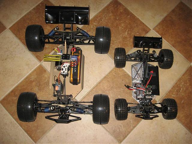 Well...this is the best I can do...I don't have any 1/10 scale cars except for my FLM Maxxs. These are the two projects that I am working right now...just need a few more parts to make them run.