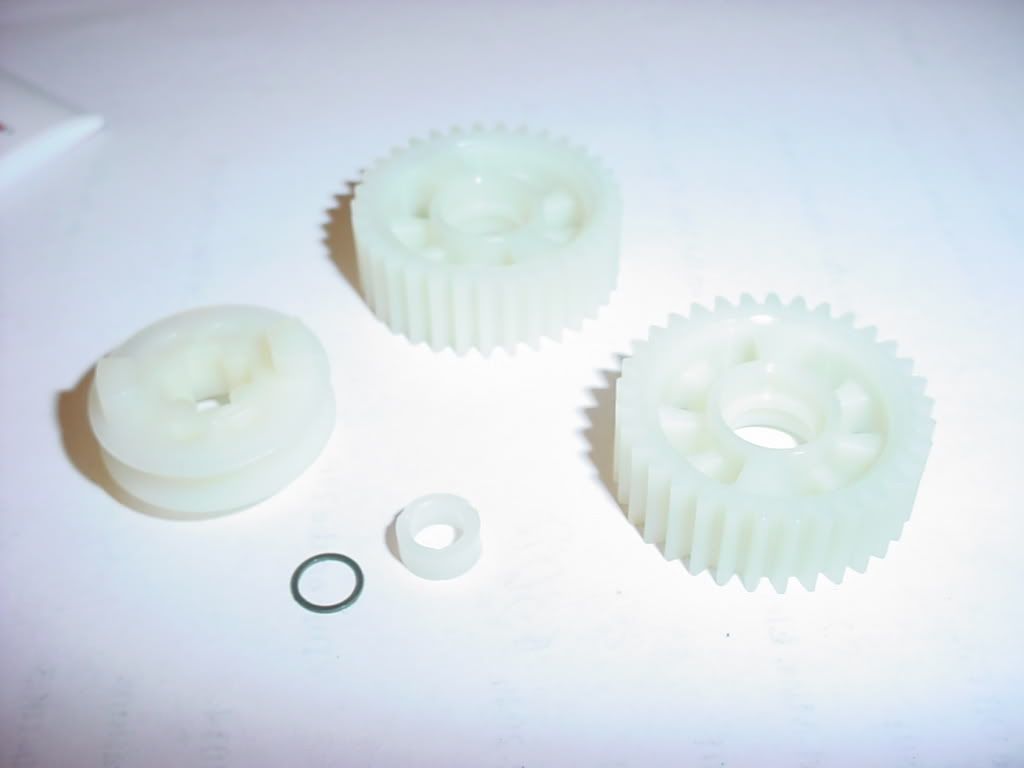 Both output gears are the same tooth count, but look thinner and weaker than the single speed output gear. This also adds a drive dog, but it is somewhat smaller than the original tranny drive dog. The upside is, they do appear to be made from a better material, Delrin I believe.
