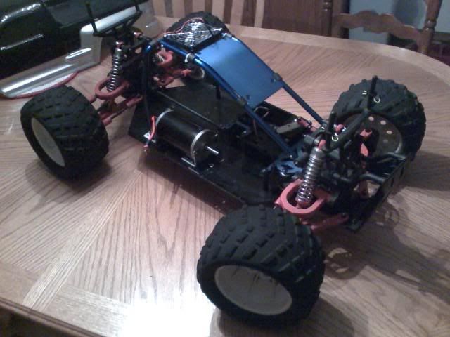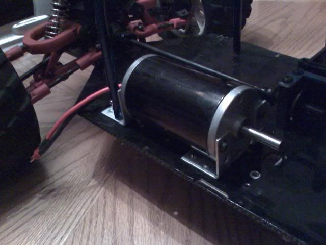 Well guys after a long wait my build is finally back on track. The motor was installed awhile back with four 90 degree steel brackets to hold it 100% secure onto the chassis. Im going to be running all 10awg wire. 10awg wire is already installed onto the motor output with deans connectors. I will be purchasing more 10awg for the harness to wire three 12v PB's toghther into one ESC. I will for sure be using an AstroFlight 204D "HV" brushed airplane ESC. It handles up to 60 volts input and has a 60a output. Ive talked to people on RC-Groups that run combos such as mine in their planes with similar motors minus the heavy batts and they say that the esc doesnt even get a tad bit warm so im confident it'll be fine. Plus its going to stay below 30 degrees here for the next 4-5 months or so. The rollcage was reinstalled and I cut out the 2nd servo mount in the front for room for the ESC. The batteries will be placed one behind the motor and 2 on the left side of the chassis towards the rear. Total weight will be around 32.8lbs. Ill post pics of it here in a few minutes.