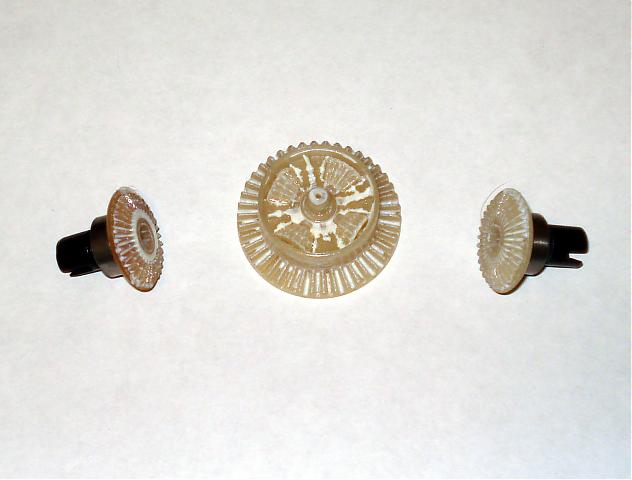 The Front and Rear diffs are open style gear diffs. These are actually thinner than MQ and are NOT compatible. Ok, everyone say it all together now.... "BOOOO, HISSSS, GRRRR, ....... Hey Batter... batter... Swing"!.... [&:]... I actually noticed that the diff housings seemed a little thin from the outside, so I was expecting something different. To be honest with you, I'm not impressed at all by their looks. They look cheap and brittle, and one of mine is white while the other is an off shade of yellow...? There are two things that can cause this during the manufacturing process. 1) not blending the plastic pellets well enough before injection molding, resulting in an uneven batch color. 2) melting or injecting at a very high temperature causing the plastic to discolor. Either way, the plastic used doesn't look good, but seems to work fine.