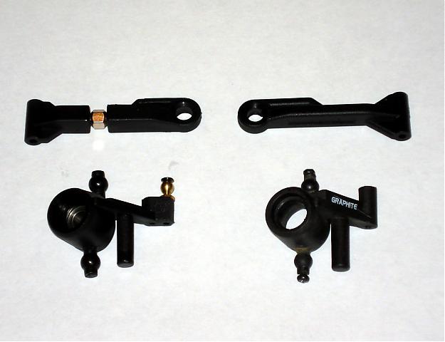 Uses a dual bell crank set-up similar to the MQ, but like everything else.... slightly different. The outer plastic housing is identical to the mini quake... right down to the size of the bushings used. *Tip* to reduce steering slop, install four 4x7x2.5mm bearings in the steering column.** Ok, here's the difference. The alum support column on the Rage features a "half moon" mounting pattern vs the "hexagon" pattern of the MQ's support column. Obviously these are not compatible. You should, however, be able to use a GPM alloy MQ steering column with the XTM's support columns if desired. Since the outer part of the column is the same, there should be no problem.