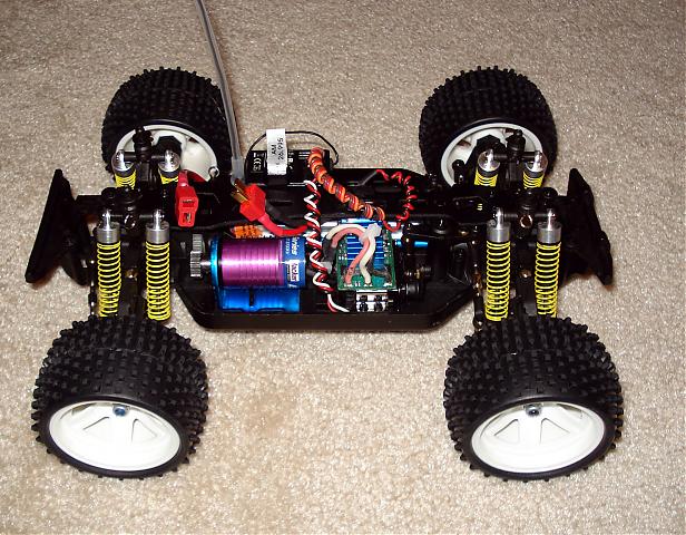 The XTM Rage features your "run of the mill" rtr electronics: 27mhz am radio, generic 400 size motor, low budget esc, and low budget mini servo. The Rage differs from the MQ in that it uses a lighter mini servo vs a standard size. Actually, I believe a standard size servo will NOT fit in this chassis. The chassis is molded for a mini servo and is held down by double sided tape and a little "L" brace on the top. One thing to note about the servo... its strong, but sssllloooowww.... you won't win any races with it installed... that's for sure.