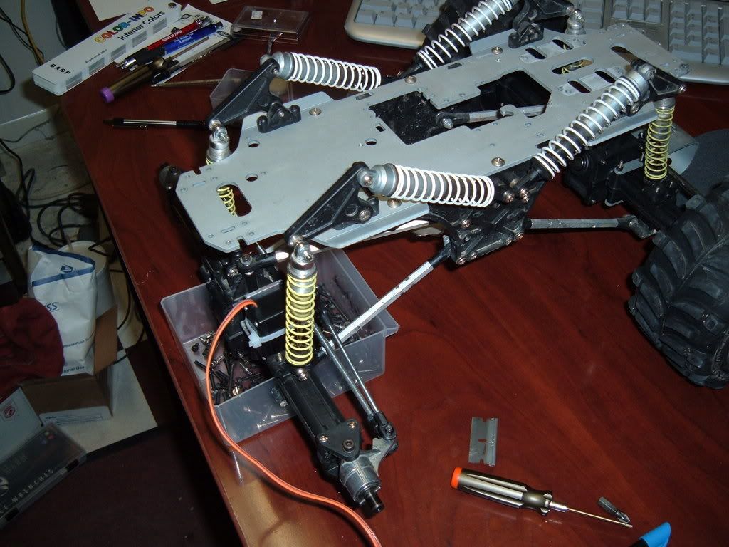 So I modified the truck for behind the axle steering. This allowed me to remove the large front servo mount, and move the links behind the axle for more protection. I also got rid of the servo saver. Steering is much better no, alot smoother than with the round spring style servo saver. Plus I have a much better approach angle, as the servo mount actually stuck out past the front wheels!