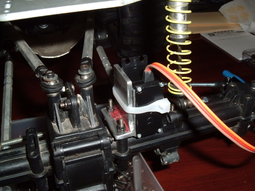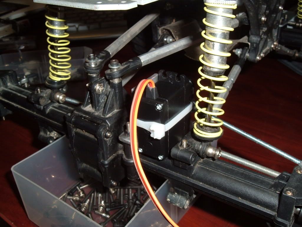 Basically just flipped the hubs so that the steering arms faced the rear, and fabbed up a link to tie them together, and another link to go from one hub to the servo arm. Made a L bracket to hold the servo, and attached the servo with servo tape and a zip tie. The servo just misses the chassis at full suspension compression. The long link that connects the hubs had to be slightly ben to clear the lower links, and the pinion. I may mod the hubs slightly to raise the link up a mm or two. If I can do that it will fit perfectly. Right now it lightly rubs on the lower links when the truck is fully articulated.