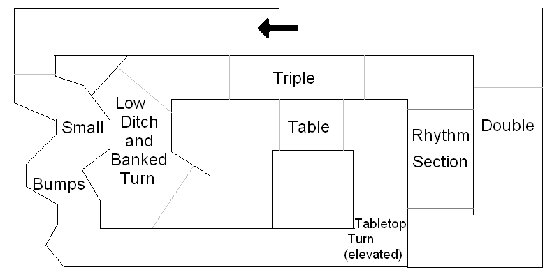 I have the opportunity to build a fairly large track (if you consider ~100ft x ~50ft large) at my Stepdad's MX/Camping area :) . I was just thinking of a good layout (~1/8 buggy sized) that would fit the space. I'd like to see other people's thought up layouts to give me some ideas, here's my layout, don't worry about all the sharp edges, those would be rounded, of course. :L:
