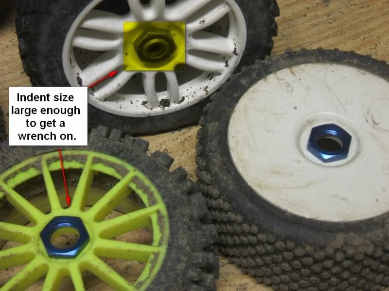 One thing to look out for when buying rims for you buggy is to check the indent around the nut. I already had the badlands glued to the rims when I found this out. Once I took the wrench out to tighten the nut down on the tire. I found that the indent around the nut wasn't large enough. The indent wouldn't allow my wrench to slide down on the nut to tighten it. I did my best to tighten it but I ended up losing a 17mm nut due to this. I will be able to use the setup on my slayer with the 5mm locknut. It would be a pain to run these on the buggy all the time. You can see in the picture below the amount of space around the nut on the white rims that your wrench will fit down into. The yellow rim with the badlands indent comes right up next to the 17mm nut.