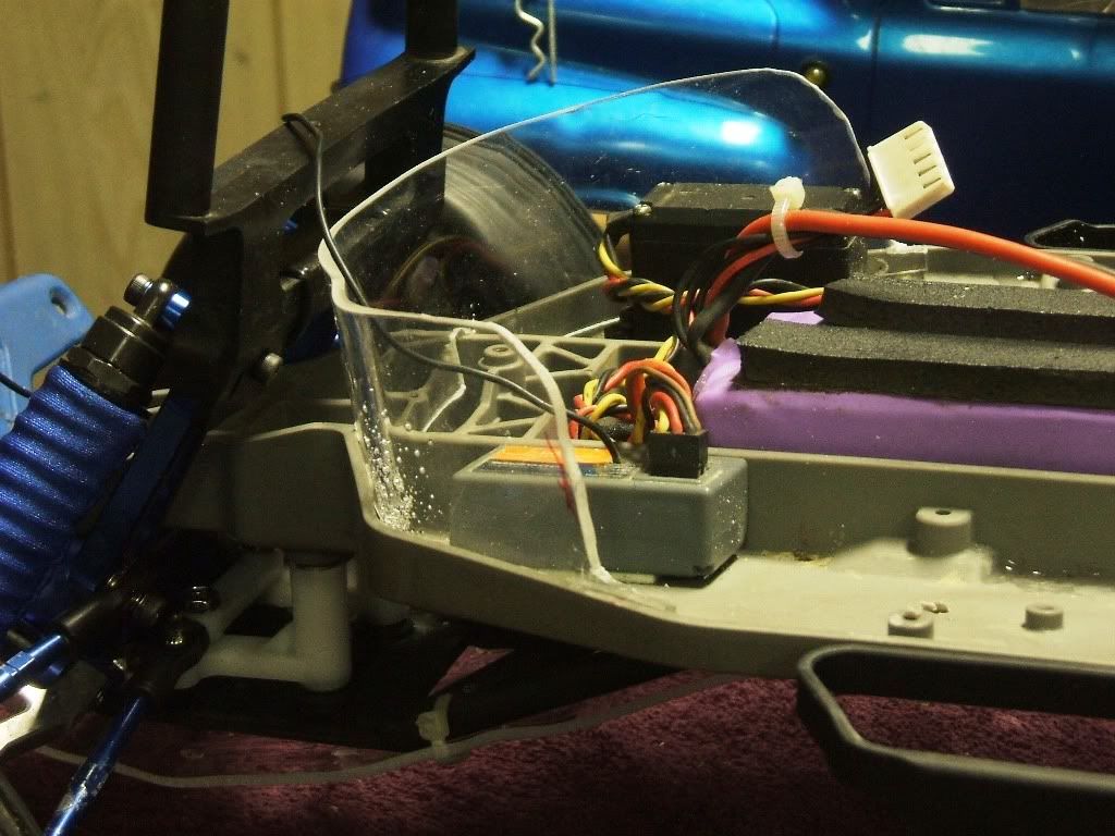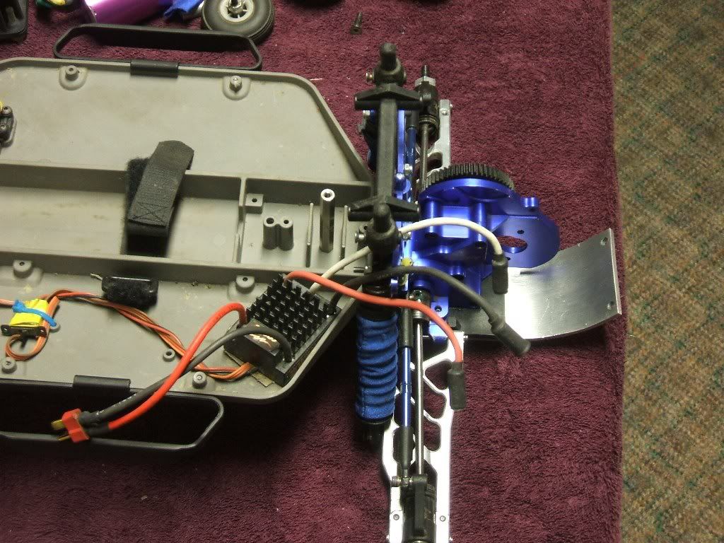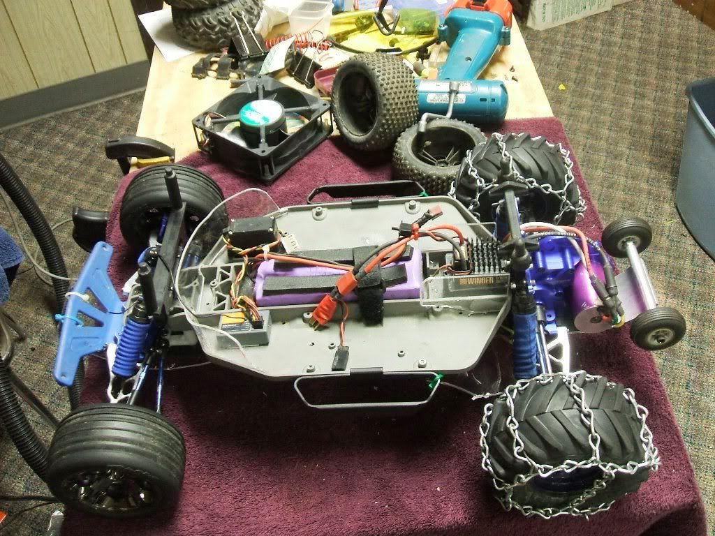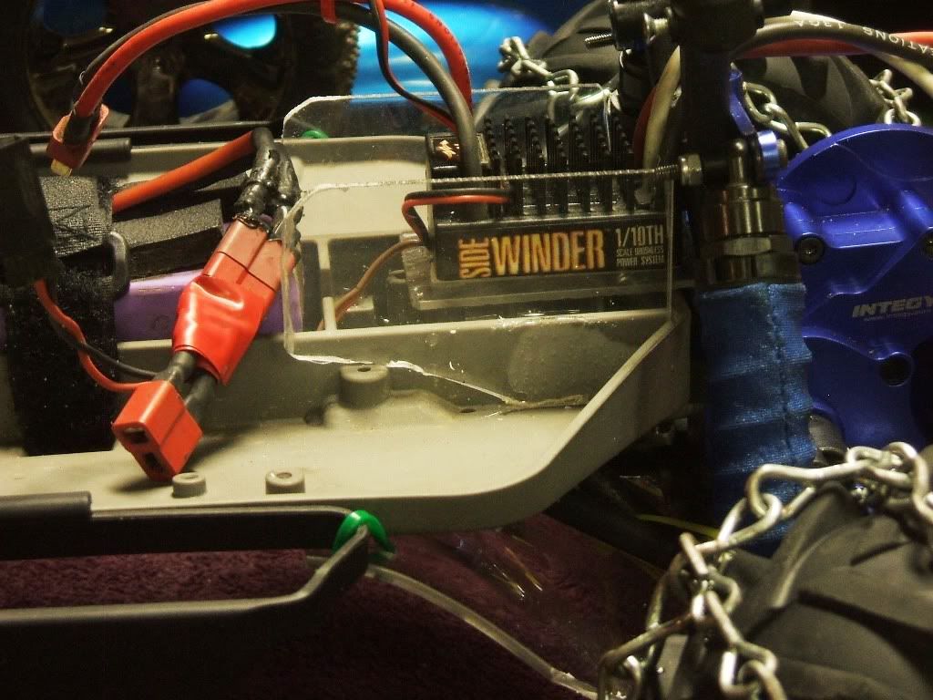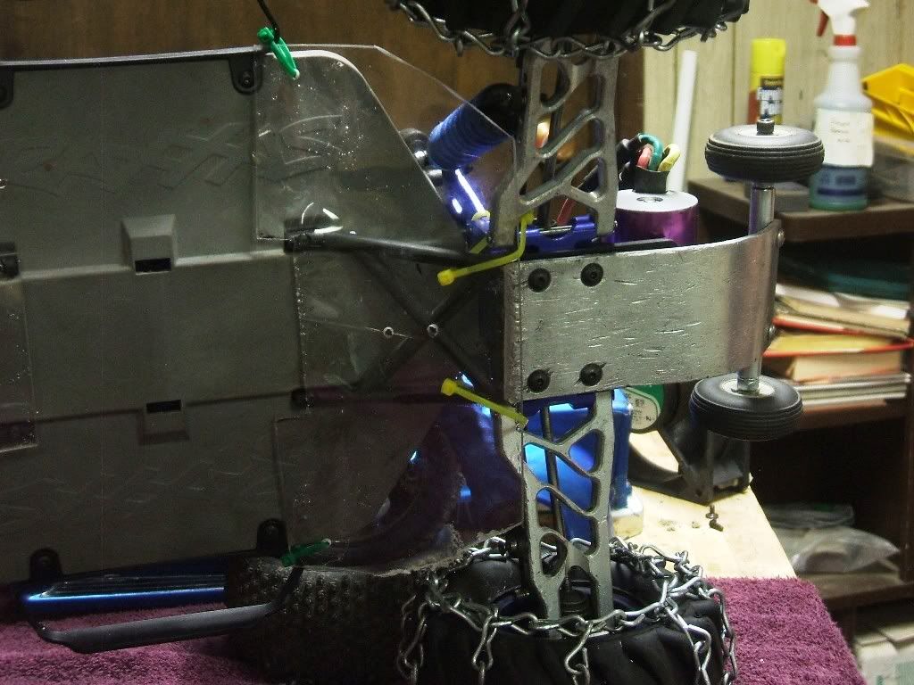 You might have notice the chains on the tires and the plastic I added to the bottom. Been stuck inside house for a couple of days. Due to adverse weather conditions. The snow plows are making it to the residential areas and I finally got the street outside the house plowed. I took it out ot try it but the chains were hitting the body. So instead of fixing it I grabed a different RC and went out to play. I mean went out to test the RC. The plastic on the bottom was just messing around seeing what I could come up with what would go through or on top of the snow better. It isn't lexan so it will break too easy to be practicle. I would use a lexan if I was going to try for something more durable. Also tried a couple of slash-splasj type gaurds on the inside of the chassis. Bent a peice that goes around the front and then a couple of side boards for the esc. I've been meaning to get the slasher receiver box for a couple of hte RCs.