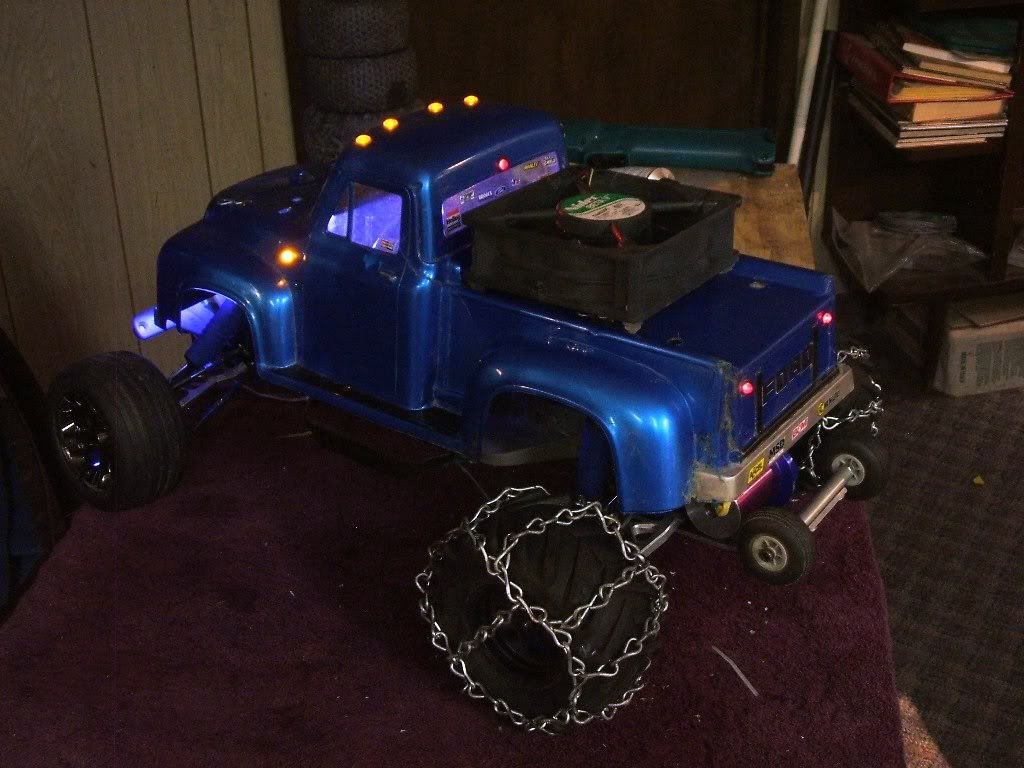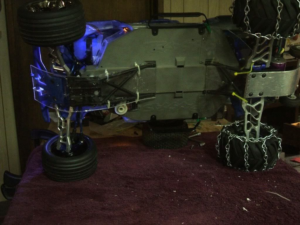 I tried the body from my slayer on it but it just didn't do anythng for me with the tires I had on it. Just seem too big or something. I am using a body for my e-maxx. Added some LEDs to it that plug into the 3s. All the wires are in the body sections so just need to plug it in.