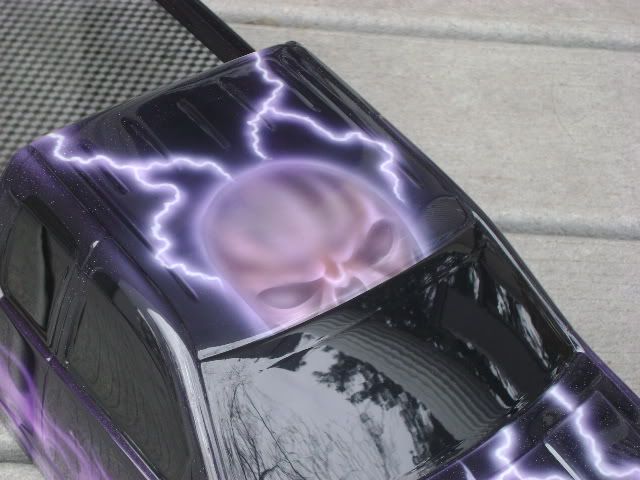 Violet pearl true fire and lightning with freehand painted skull on roof looking over a graveyard of skulls. The black base has a multi color pearl that shimmers in the sunlight.