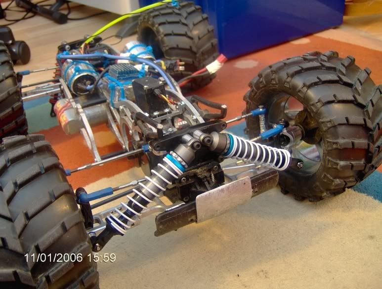 Well because the shocks are so long, I've had to do some custom mounting. The only way to mount them without increasing weight too much or mess up the CG was to custom-mount them like this: