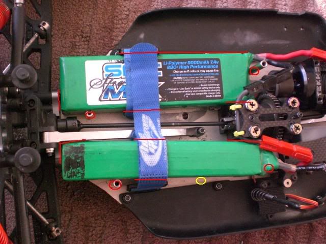 I have installed a couple posts to hold the lipos in place, and I also cut out a couple slots in the chassis for the velcro straps to pass through the chassis to keep the packs in place.