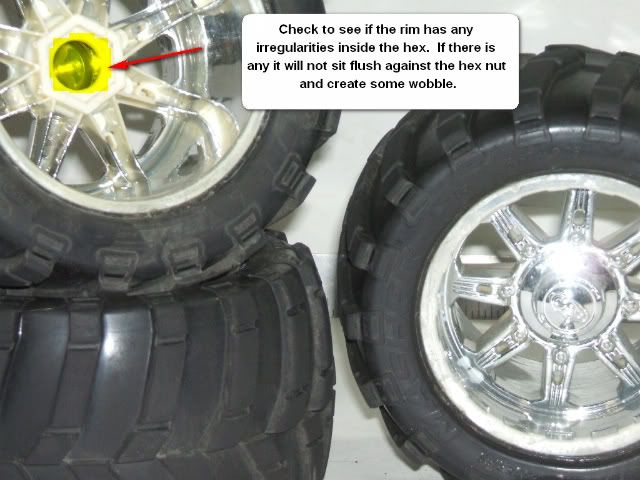 K. One of my wheels has been wobbleing on each axle I put it on. I think its the wheel itself since if I turn my diff by hand it pivots on the bearing a lot. It does this on all of the axles. Any Ideas since i haven't used them in 2-3 months and they still do it so i'm stumped. The wheels are Proline Big joes mounted on Proline Mambo rims. Can someone help?