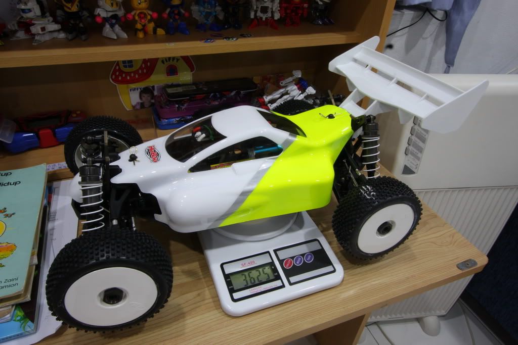 Last time i weighted the car it was around 3600g ready to run. I make some small changes (HD center diff etc), but I guess it should be more than 3650g now.