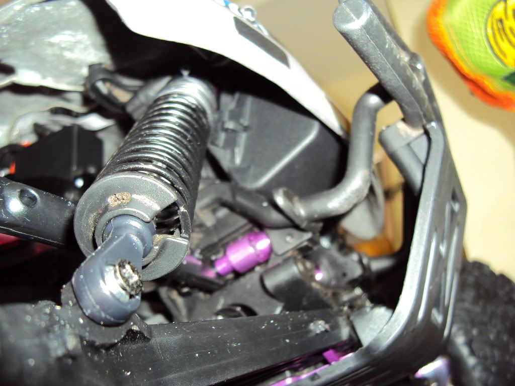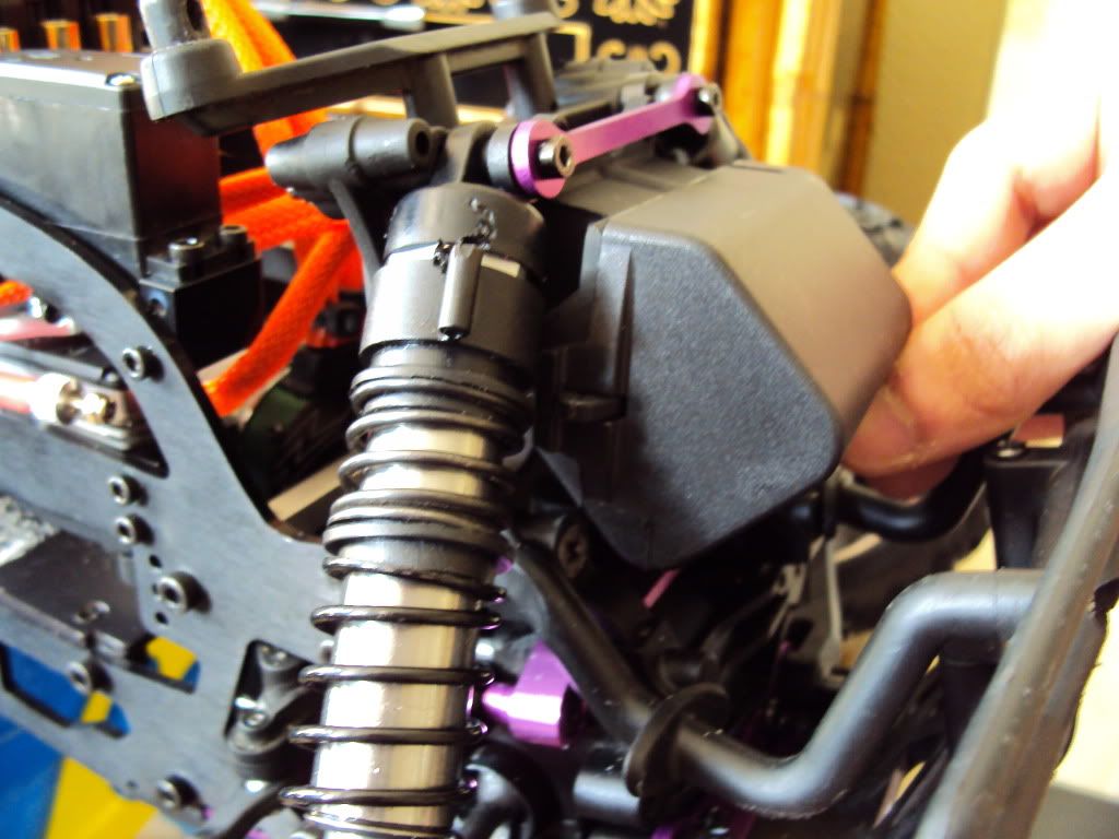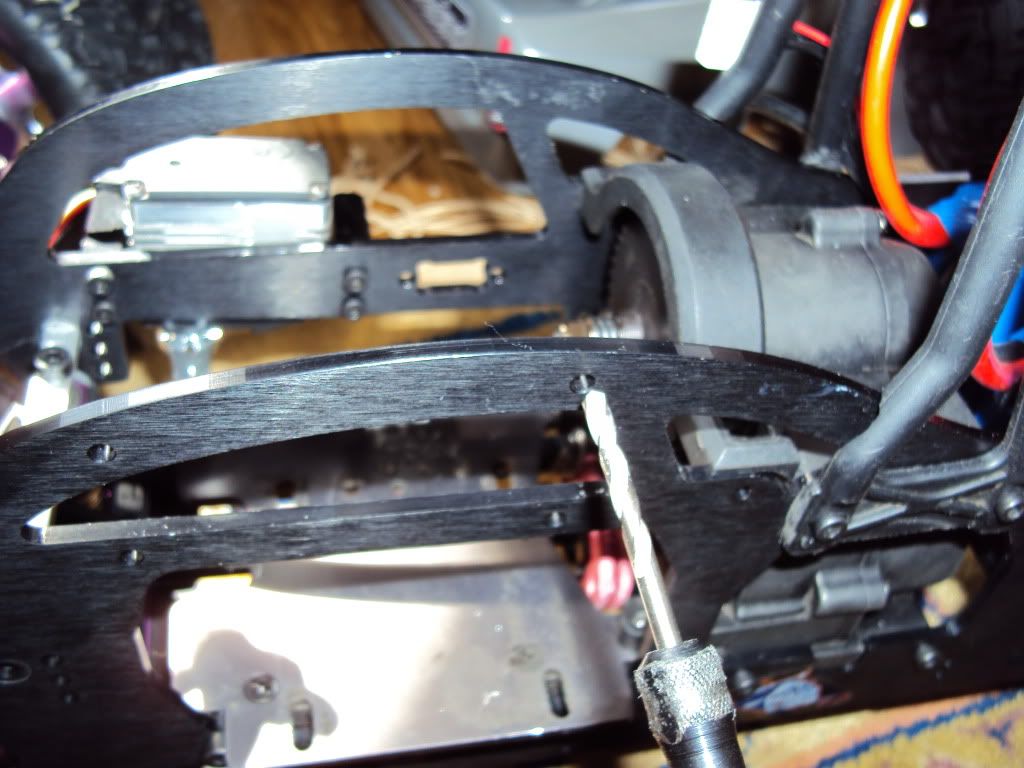 In order to get everything to fit nicely in the battery box which i am mounting at the front of the truck once my PRC Rush battery box mount comes. I had to cut a larger inlet for all the wires, and run the wires through the centre of the shock tower... THIS SHOULD BE FINE RIGHT???? *