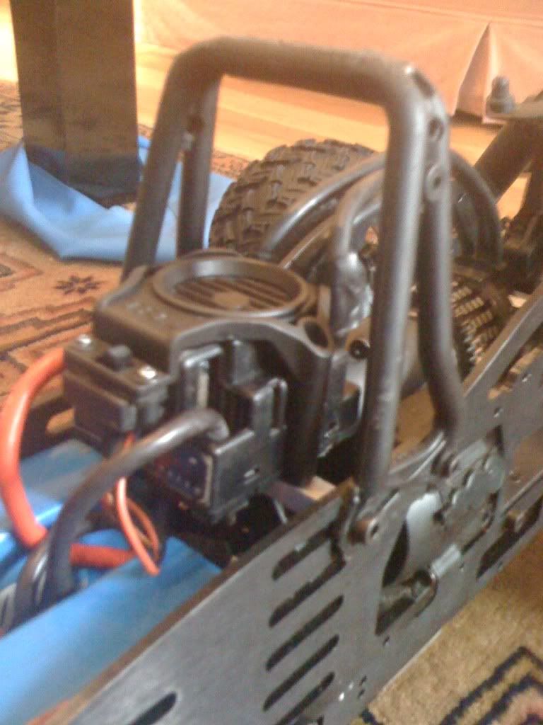 I would run a mounting plate across above the motor, and mount the esc on that so it sits lower, or maybe something over the lipos on a plate, just doesnt seem safe where it is now, even with a roll bar and fibreglass shell.