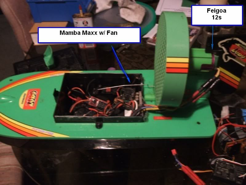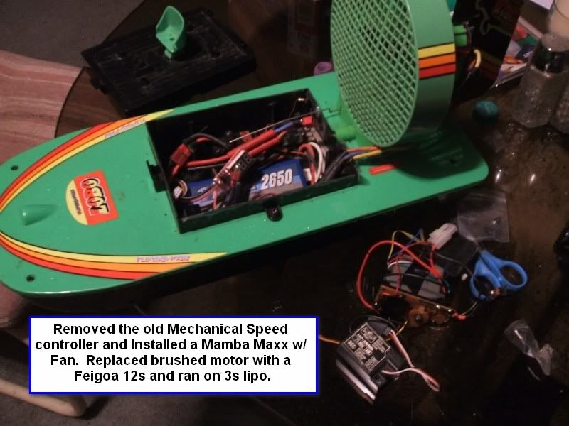As luck would have it no such brushed motor could be found in my junk drawers. A blessing one wasn’t found. How was I going to get the Mustangs battery to stay a float let alone fit into the Lobo? My attention suddenly focused on an un-expecting Feigoa 12s brushless motors sitting on the work bench. Not wanting the unrespecting juvenile delinquents to leave before the lesson was taught. I rushed to removing all the old electronics from the Lobo. Like an auto mechanic, bent into the engine well of a car. Out came flying parts, a servo, mechanical speed controller, and radio receiver. Okay, slight exaggeration of them flying out. The motor was tough to get out. I didn't want to crack any of the plastic on this soon to be updated classic. I was thinking Ford Pinto with a BIG BLOCK in it. I installed the mamba maxx in it, added a fan for cooling, jury rigged a new servo to control the steering blade. The hard part was going to be getting the motor installed. The motors cans were the same size roughly but the 12s was reluctant to go all the way. I pulled it back out gave it a good licking all the way around and slide it back in. About halfway it stopped as if both hand were against the door frame holding itself back. I gave it one more grunt and pop it was in. At that time I knew I was screwed and was going to regret putting it in there when the time came to removed it. It may never be removed. Anyways looooong story short. Took it down to the creek and to my disappointment the little heathen had moved on. Probably went to go and heckle some other respectable member of the community. I ran it on a 3s lipo. I checked the temps a couple of time during the run but let it go all the way until the lvc cutting. I checked the final temp at the end of the run. The motor and Mamba Mix was cooler then a penguins butt (another exaggeration, I don't know how cool one actually is. Leave that to the proctoligist to finger out). The Lobo as you expected did a lot better breaking through the rapids. Its rear end did sit a bit lower in the water but didn’t let any water. Not what I really want in a boat and too powerful for a fan on my desk. It now is sitting back on the shelf. All lime green except for a purple motor it now calls it's owns.