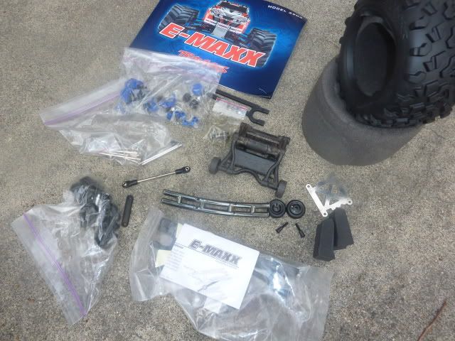 Stock front bumper, Battery hold down kit (For using those bigger batteries), ring gear for a diff, body pins (x8), some decals, 1 extra spare new tire, and 2 foams, an old wheelie bar (Cracked, but can be used for spare parts..), as well as x4 stock wheelie bar wheels, stock steel steering drag link, x2 battery foams, a bag of shock parts, bag of hinges, a bag of a couple axle rebuild kits, an extra battery hold down bar, manual, and some other misc parts.