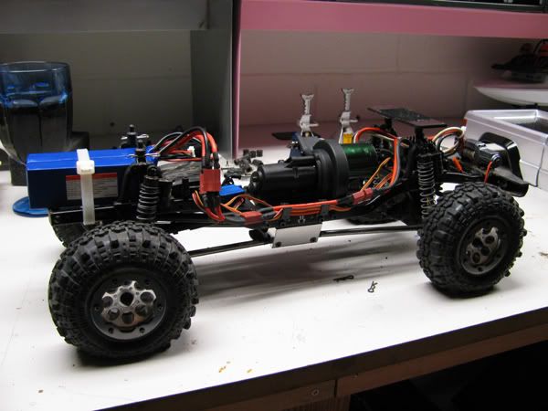 If you want a sick little trail rig you have to check this thing out! Probably does around 20mph with a 55t lathe motor in it in 2nd gear, and creeps in 1st. I'd love to keep this but just snagged a 5T and don't want to be divorced :D