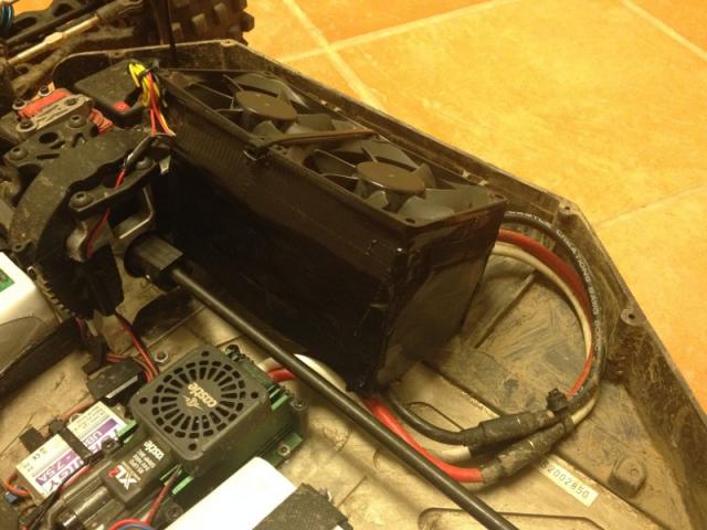 2 12v 80x80 fans wired in series and fed by the main batterys and a simple wind tunnel to optimise airflow somewhat.