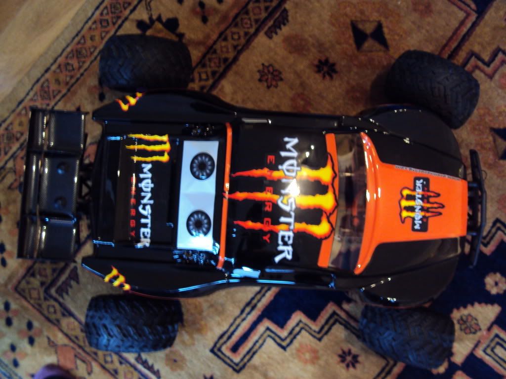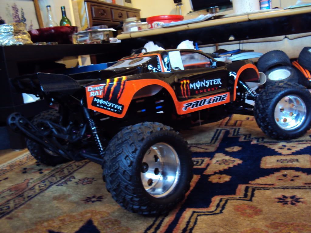 I have a new 18t pinion and 47spur coming and it should lower my top speed to 55mph on 6s. Ill see how my temps fair after that... Cant run at the moment as i lost a wheel nut on my last run and waiting on the replacements.... Anyway in the quest to keep my weight down... i no longer use the heavy fibre glass body and managed to finish painting my desertrat body... what do yall think??? http://i878.photobucket.com/albums/a...7/DSC00265.jpg http://i878.photobucket.com/albums/a...7/DSC00264.jpg http://i878.photobucket.com/albums/a...7/DSC00267.jpg http://i878.photobucket.com/albums/a...7/DSC00266.jpg It came out well for a first paint job :) |