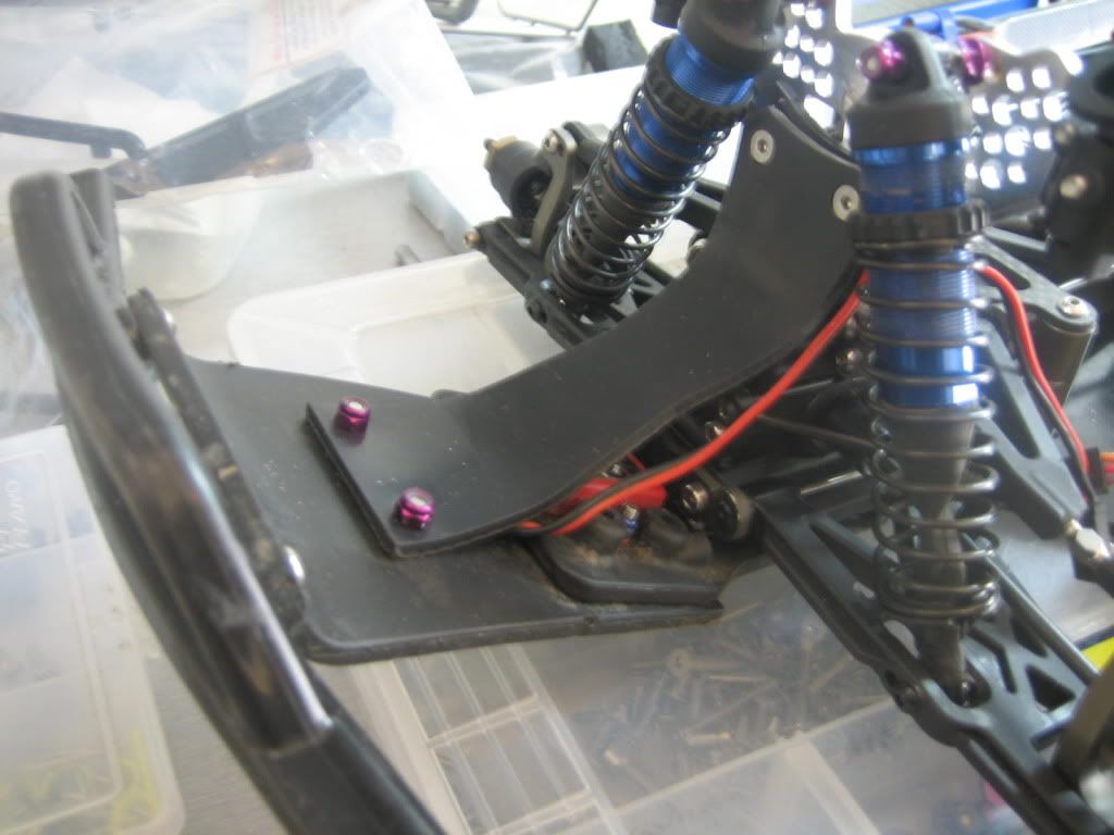 first cut the arms off the "Y" shaped stock part. i shaped mine to be the same shape as the tbr brace. then you need to use a dremel or 1/8 drill bit and grind out a tiny portion of material from your ERC tower where you see the screws with purple locknuts mounted in the pics. mount the plastic piece to your ERC tower through the bottom holes that mount to the top of the bulkhead. http://i471.photobucket.com/albums/r...ujames/002.jpg http://i471.photobucket.com/albums/r...ujames/003.jpg then mount your tbr brace through the top holes of the plastic part and through the tower. secure on the back with locknuts. next, mount up the slash bumper. the stock holes line up close enough to just mount to the chassis. line up the holes in the tbr brace to your slash bumper and drill 2 holes. counter sink, and then screw it together. viola! (the wire you see in the pics is my AMB transponder) http://i471.photobucket.com/albums/r...ujames/007.jpg http://i471.photobucket.com/albums/r...ujames/006.jpg http://i471.photobucket.com/albums/r...ujames/005.jpg http://i471.photobucket.com/albums/r...ujames/012.jpg http://i471.photobucket.com/albums/r...ujames/008.jpg |