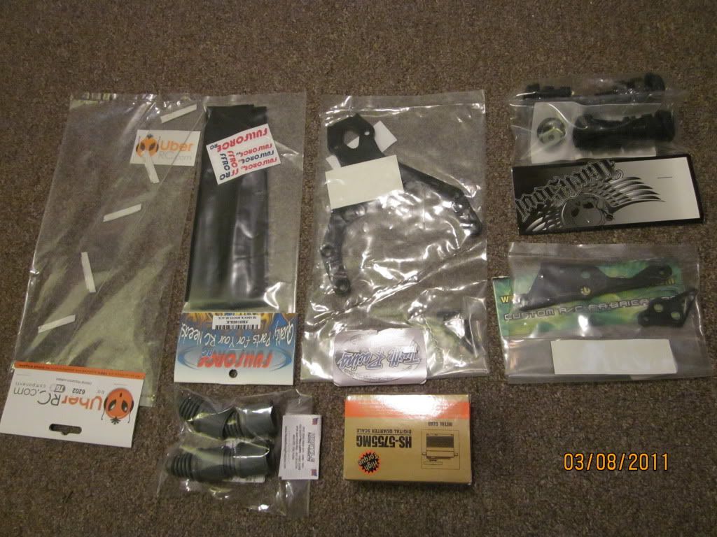 Clear uber rc panels to close off chassis,ffrc black shock socks, turtle black top plate, black dark soul axle extenders, black beefy engine mount braces, grey hostile axle boots, hitec servo with ddm arm