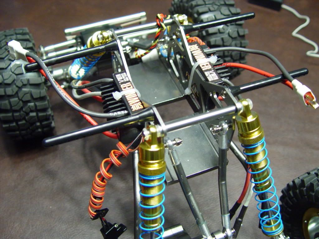 New chassis plate position: http://i52.photobucket.com/albums/g4...g/DSC00261.jpg Everything fits so nicely with this setup. With the plates the way they are, they serve as a full-length skid plate as well. Battery pack on-board: http://i52.photobucket.com/albums/g4...g/DSC00260.jpg The pack is going to be an 8 cell NiMH (those cells are mock-up only) in an offset 5x3 configuration. Modified Futaba radio: http://i52.photobucket.com/albums/g4...g/DSC00264.jpg Modified, in that I turned the right stick 90* CW. I had to extend a couple wires and do a bit of dremeling inside. All is well and I can switch it back without issue if need be. The 6EXA has some nice wing mixing programs built in. I plan on trying to set this up so that I can have front OR rear dig- while moving forward OR backward- all just by moving the stick. The SWs go on separate channels. Vertical travel controls F/R throttle. Horizontal travel controls proportionality of throttle to the F/R motors. Also, only moving the stick horizontally makes the F/R wheels spin opposite, so I should be able to crab-walk too! Now I just need that 4WS upgrade! SO if the stick is moved into the: Top- Forward on both F/R. Bottom- Reverse on both F/R. Top/Right- Forward w/variable rear dig. Top/Left- Forward w/variable front dig. Bottom/Right- Reverse w/VRD. Bottom/Left- Reverse w/VFD. Cool, huh? :smile: I hope it works! I plan to use a Futaba S9156 for the steering servo. |
