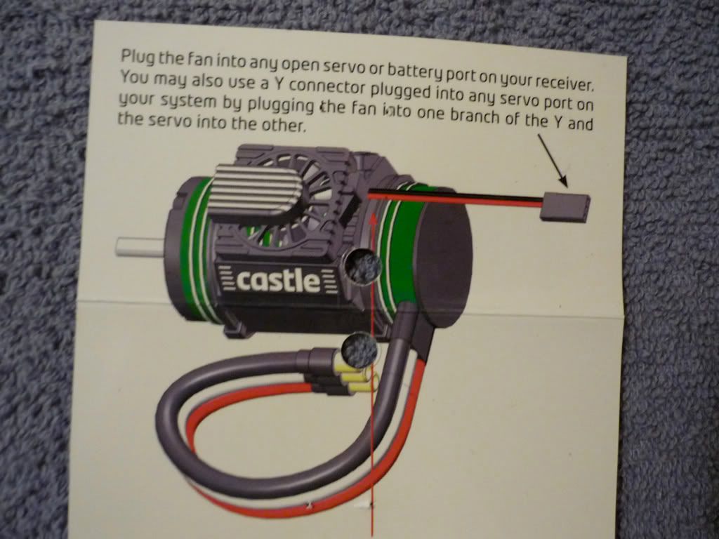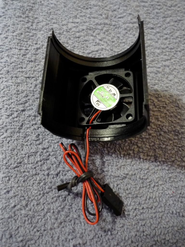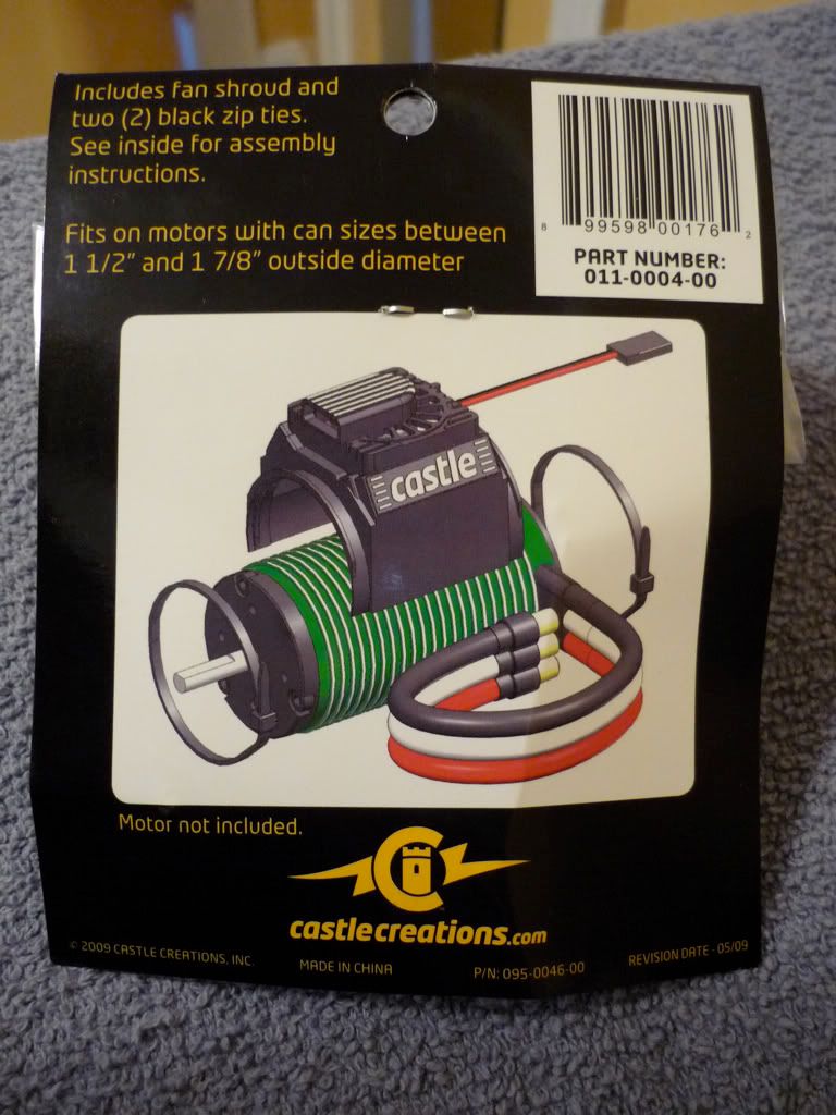 It is made of all plastic (seems pretty sturdy), so it's only a fan and shroud, no heatsink. The plug is a standard servo plug with red/black wires (no signal wire of course). The wire is a bit smaller gauge than standard servo wire, would have been nice to have a little bit thicker wire. The shroud over the fan seems to have an intake of sorts, almost like the blower on the hood of a hot-rod. The top of the fan is open so I'm not sure how functional this intake will be, but maybe there is a reason Castle put it on there. If you look at the way the plastic case is shaped it almost looks like they were trying to make it look like a V8 engine (could just be my imagination though) The fan uses a DC brushless motor. It's rated for 5V and will draw 140mA at that voltage. The fan model number is YM0503PVS1. It has a small logo on the label but I'm not familiar with it, maybe someone can make it out in the picture. Now I just have to get my E-revo back together so I can actually test this thing! http://i47.photobucket.com/albums/f1...3/P1020452.jpg http://i47.photobucket.com/albums/f1...3/P1020453.jpg http://i47.photobucket.com/albums/f1...3/P1020454.jpg http://i47.photobucket.com/albums/f1...3/P1020458.jpg http://i47.photobucket.com/albums/f1...3/P1020456.jpg http://i47.photobucket.com/albums/f1...3/P1020455.jpg http://i47.photobucket.com/albums/f1...3/P1020460.jpg http://i47.photobucket.com/albums/f1...3/P1020459.jpg |