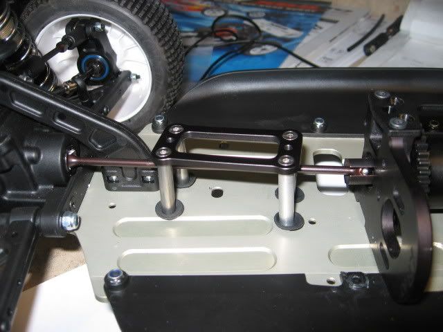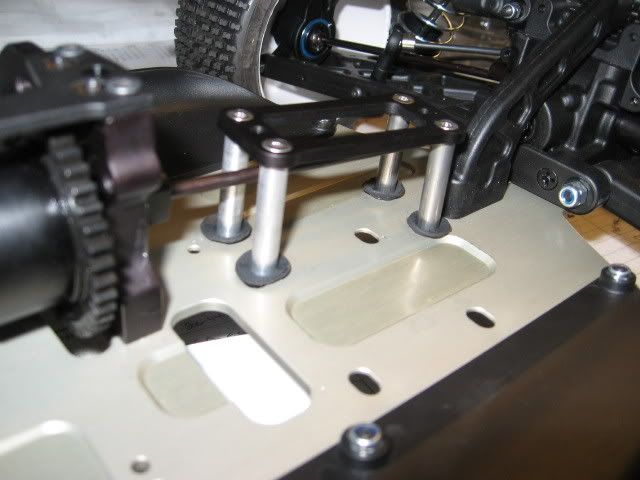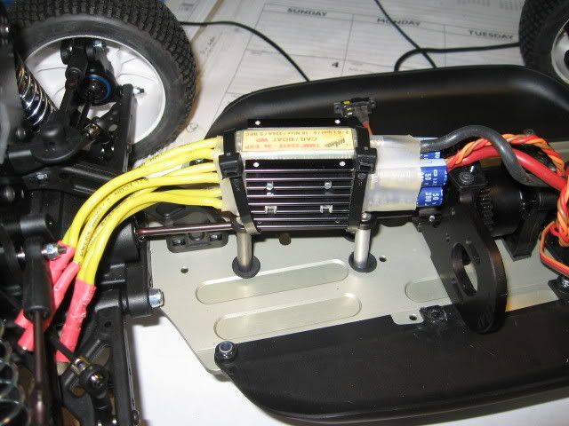 Thank you all for your above comments!!.. I really appreciate the feedback.. Here are some updates is should have included in the last one. Sorry me bad.. I thought I would take a second out and share with you the three modifications to date that I’ve had to perform in order to switch this Nitro burring, gas spewing, ozone depleting, garage smelling bad boy!. Into the environmentally friendly, local park driving, neighbor liking (E) buggy that kind of (hhaa haa) stand here today!.. The first modification required in order the fix the height deficiencies when installing a RCM engine mount. This modification was needed to increase the front side height of the canter diff. I ended up cutting a piece of carbon Fiber and drilled two holes on it to match up with the existing center shaft tower mounting holes. http://i264.photobucket.com/albums/i...7/IMG_2948.jpg The second modification was to the battery tray. I used a ½ forstner bit and drilled down just until the bit penetrated the base holder, this allowed me to countersink the existing body screws into the holder and use a longer bolt with a counter sink ¾ washer on the top allowed me to secure the battery holder to the chassis. I also noticed that I could take the battery try and use my belt sander to takeoff another 2mm getting me to 39mm in deck height. I'm just not sure what the stock deck height number is?? Do you know??. http://i264.photobucket.com/albums/i...7/IMG_2947.jpg http://i264.photobucket.com/albums/i...7/IMG_2960.jpg Once I mount my ESC and receive my body back I’ll be able to fine tune the battery try holder for maximum wait distribution. At its current location with a 5s 3700mAH on board it sits exactly 40.97mm (41mm) above the bottom of the chassis. http://i264.photobucket.com/albums/i...7/IMG_2950.jpg The third and final modification was to accommodate the ESC, after reviewing several other member threads and trying different locations / placements it was decided that it really needed to be mounted in the center rear for (Ease of acess, clean wire runs and CG) but I need to lift it off the chassis and mount it over the rear drive shaft.. after several deep thoughts and a glass or two (hmmmm) I used the alum servo holder that I had and used (4) of the ½ double threaded spacers that come in the GorillaMaxx kits allowed me to screw it from the bottom and top and made a simple secure stand, I also used (4) rubber washers at the bottom of the stand over the chassis to help cushion the blow for my ESC. http://i264.photobucket.com/albums/i...7/IMG_2955.jpg http://i264.photobucket.com/albums/i...7/IMG_2956.jpg http://i264.photobucket.com/albums/i...7/IMG_2957.jpg |