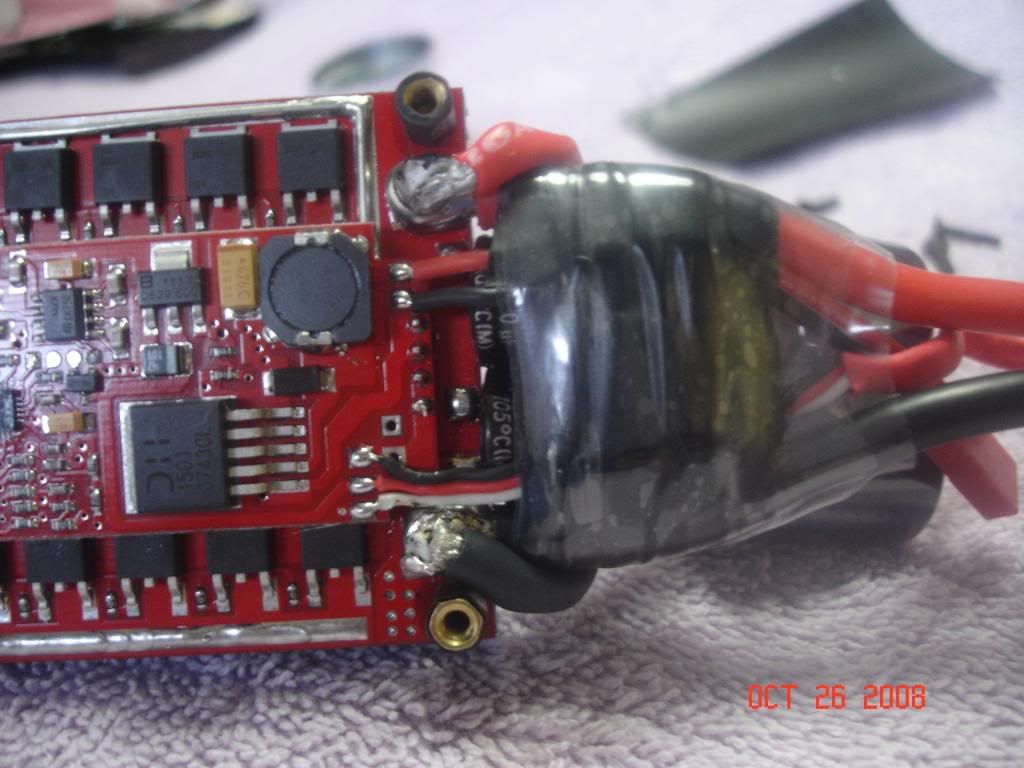 Here are some pictures of the 3mm aluminum plate I cut and installed on the bottom of the ESC. I also added the 2200 caps killajb gave me. Performance wise, I got the ESC temps to 150*F, motor at 112*F, and batteries 98*F yesterday. This was stop and go running on asphalt. I also experienced hesitation when I tried to run wot. Batteries are Neuenergy 25C 5000mah. Anyway, here are some pictures: http://i256.photobucket.com/albums/h...Picture171.jpg Also glued a piece of rubber underneath the aluminum plate. http://i256.photobucket.com/albums/h...Picture184.jpg Added caps on the power wire. I also shrink-wrapped the standoffs. http://i256.photobucket.com/albums/h...Picture173.jpg http://i256.photobucket.com/albums/h...Picture172.jpg http://i256.photobucket.com/albums/h...Picture175.jpg http://i256.photobucket.com/albums/h...Picture183.jpg I also installed some plastic spacers to clear the capacitor wires. The spacers widened the gap between the board and mounting plate. Better airflow for better cooling. The gap is about 3/8". http://i256.photobucket.com/albums/h...Picture174.jpg http://i256.photobucket.com/albums/h...Picture170.jpg Gap before I installed the plastic spacers. http://i256.photobucket.com/albums/h...Picture169.jpg |