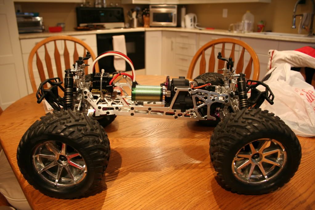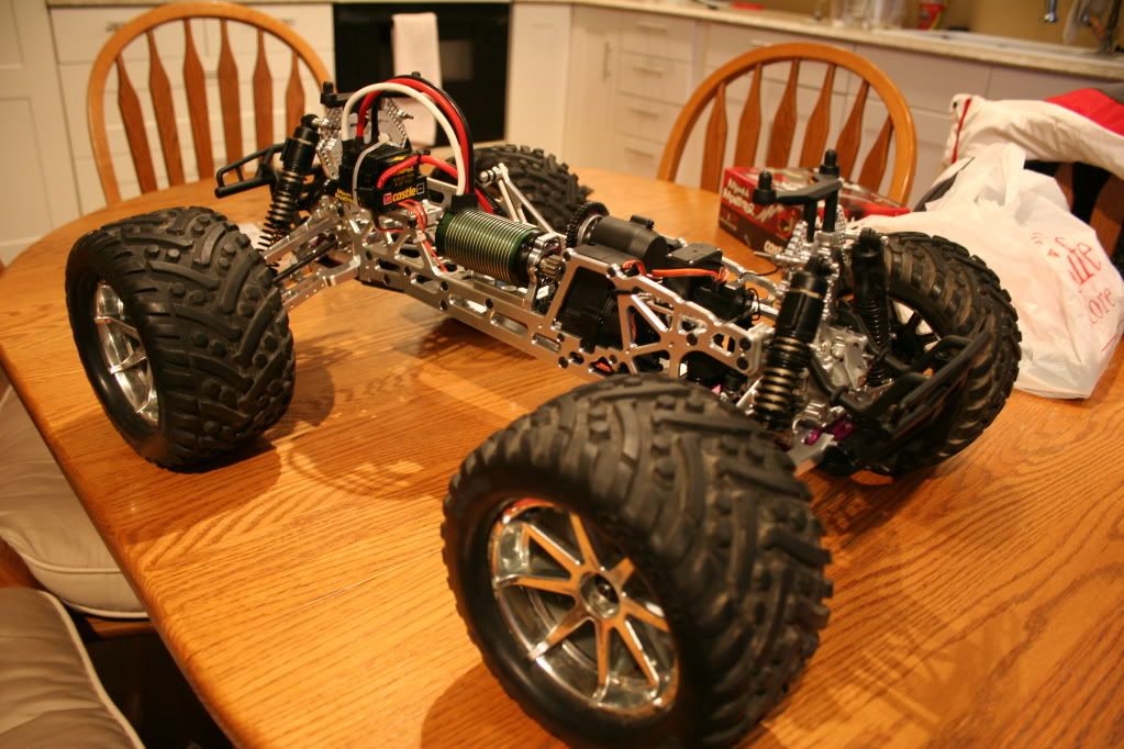 The parts for my new brushless savage have been slowly rollin in over the past little while, Its ready to run now but I decided to order the integy LST shocks, rear bearing carriers, FLM LST shock conversion (of course) and bearing to get rid on the bushings in the steering crank. Its got a savage flux single speed tranny and the mamba 2200, aluminum a arms, diff cases, shock towers, and the fastlane machine savage brushless conversion. I decided to start with a spur/pinion of 47/20. I think its going to be bulletproof, as soon as cheapbatterypacks.com has elite 22.2v H.O. 5000mah battery packs back in stock I am going to find out.