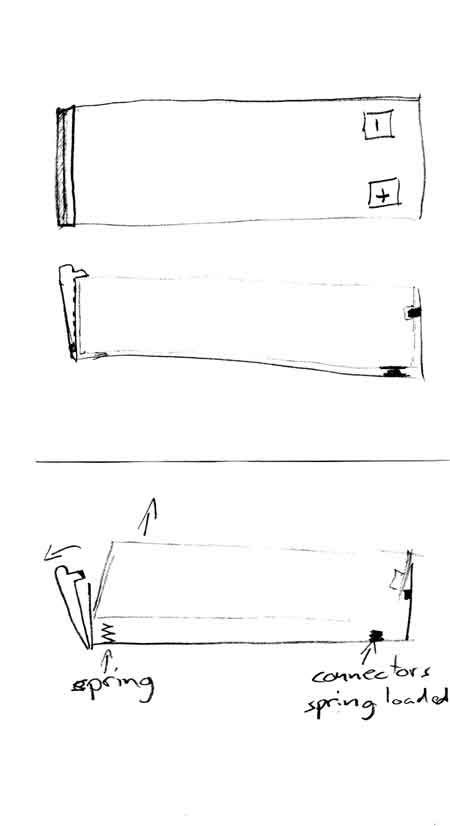 the design seems entirely too complex. all you'd need is two male plugs mounted standing straight up on the chassis, soldered 90 degrees to the wire, then push the battery upside down onto the male bullets. have fixed sides and spring loaded holding tabs on both ends. done.