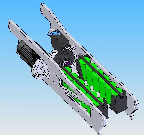 Not done yet, but an update. I need to measure a couple things and probably move the motor further back, but this is the general design. I still need to take off a bunch of material from the TVPs and find somewhere to mount more cells. Or maybe a whole different battery mounting system. Oh well. Help me out with you C&C. Thanks.