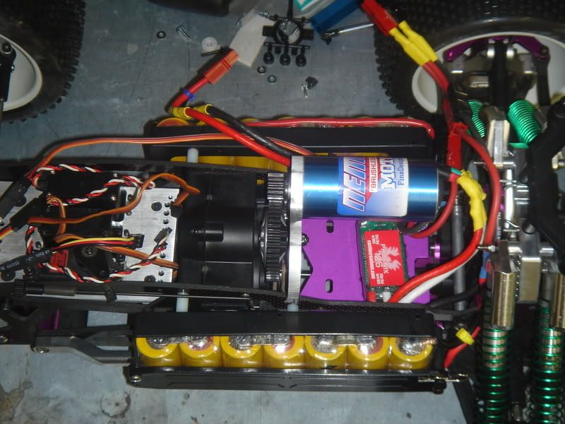 Yeah I plan on using the stock transmission, so I guess i'm going to need to keep my stock braking system, my problem NOW is that it may have a binding problem when I put on the battery trays. If there's a problem attaching a link to the brakes I will have to find an esc/motor combo that will do the stopping for me and as of now the only brushless motor combo with esc that offers a braking and reverse profile that i've found is the HV4.5 from Novak. I dont think the heat will be a problem when it comes to braking, the motor comes with a large heatsink and the ESC comes with a fan, I'm no speed demon I'd just like to have an almost maintenance free machine that'll be able to take a good beating.