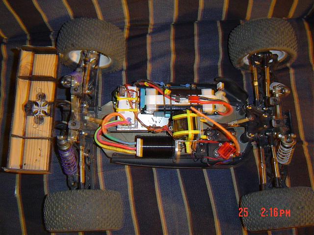 Greetings Skillx! My name is Anthony and I am the guy Elliot was talking to when you were @ T4BB this morning. Thought I would post a couple pics of my batt./ESC mount for you. I used an L shaped piece of allum. mounted to the top of the motor mounts. I found this to be easiest way to clear the side skirt mounting holes. Try to ignore the reciever pack(embarasing), my UBEC went south so I'm making do. If you have anymore questions just post em'; there is a wealth of knowledge to be gained from the brains on this forum, everyone here has helped me out alot.