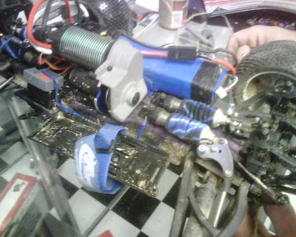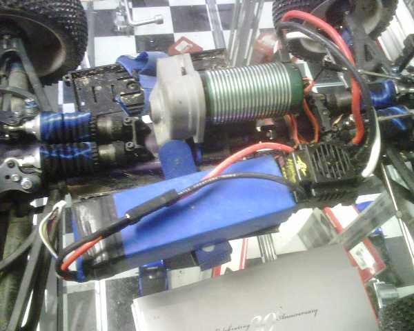 Tranny is set backwards for the motor to hang forward to hang the weight towards the front. With twin 3's its perfect 50/50. Truck runs 39mph on 3S and after 30min run, the motor is 110-115 and ESC is 101-105. Awesome setup....weighs 9.5lbs exact without batts.