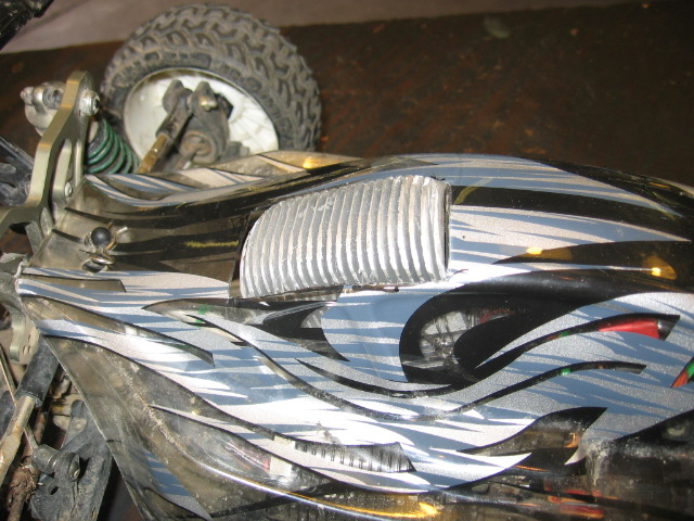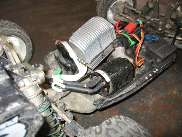 I'm pretty happy with my new heatsink so I thought I'd share. It's a Quark 80b esc and the heatsink is machined so that it fits into a cut-out in the bottom of the Quark case (inverted) and is in direct contact with the fets through transfer paste. I then epoxied the bottom of the heatsink to the case for strength and then tied the whole thing together and into the buggy with steel wire.