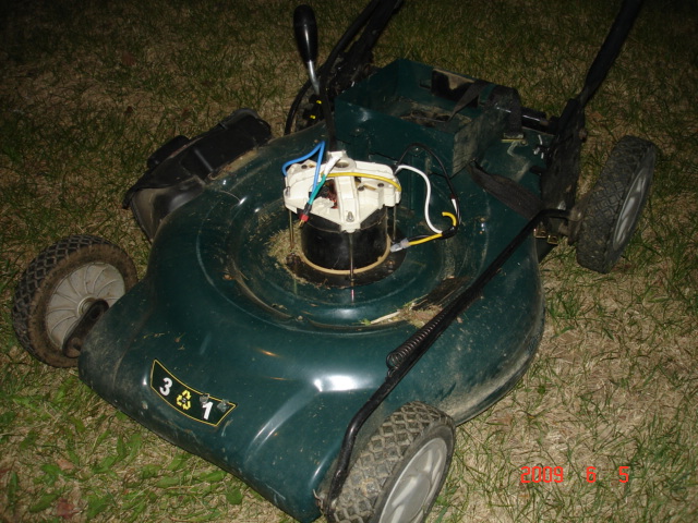 Anyways, I threw in an 8s1p A123 pack and viola, spins right up with more power than the big dual 12v/17Ah lead acids that were in there. I went to cut the grass, and I got exactly 4.5 minutes of runtime and then instant dead. Took the pack off, pretty warm (thats 15C discharge)... so i charged it back up again right away and went again. (I'll have to admit, it looked pretty darn funny cutting the grass with this tiny little battery sitting on the mower. lol)