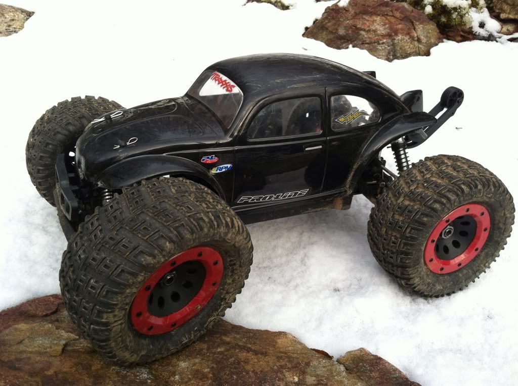 The rounded bug body definitely makes it easier to flip the truck over but I can do it with other bodies also. Even on 4s I can get the truck back up on it's feet. The tires are not taped.... I'm sure the ballooning tires helps but I Would bet it would still flip back up with taped tires.