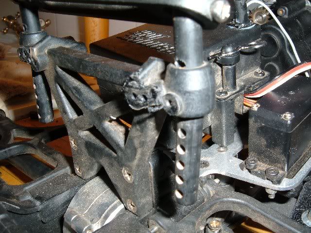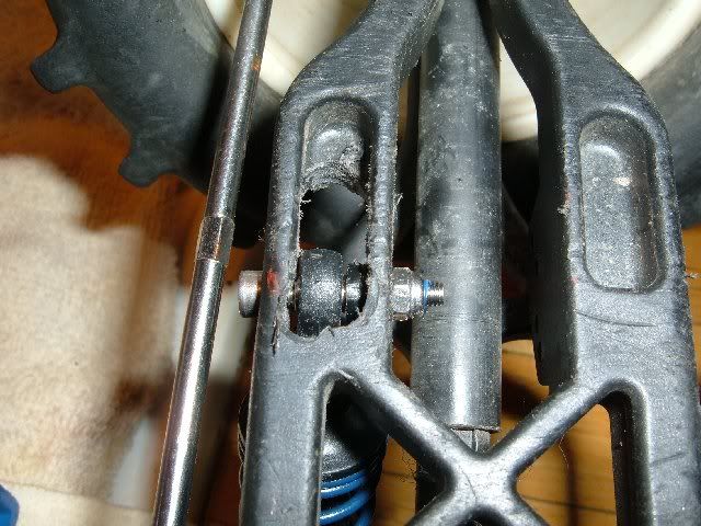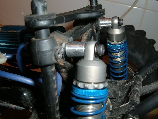 On the stock lower arms the bottom shock mount screw holes are raised up. If you were to cut these off and have the shocks mount onto the arm like a truggy. There is just a hole cut out in the arm for them to fit in and a hole for the screw. It would mean that the shocks would have to be about 15mm longer or so, to fit perfectly. I'm not sure how long the UE ones are.
